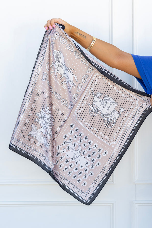 Elegant beige Juliette scarf with a whimsical horse carriage print. Made of soft and luxurious material, this square scarf is perfect for adding a touch of fun to any outfit. Stay stylish and chic with the Juliette scarf in beige.