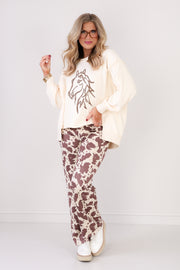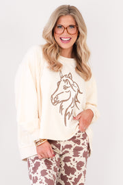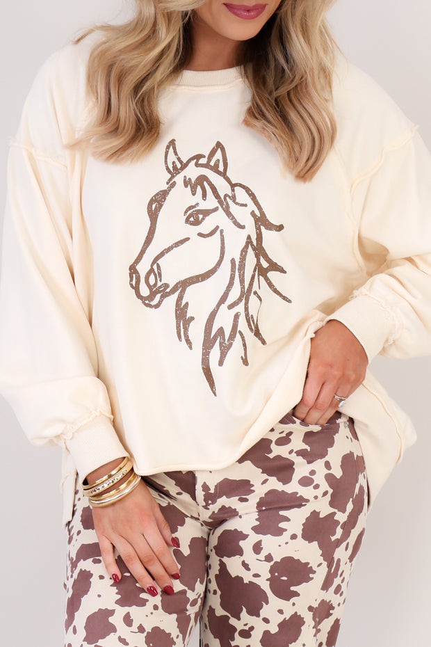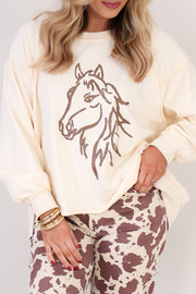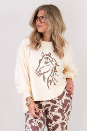 This long sleeve sweatshirt features a comfortable rounded neckline and a waist-length fit. The front is decorated with a detailed horse graphic, adding a stylish touch to a casual design.