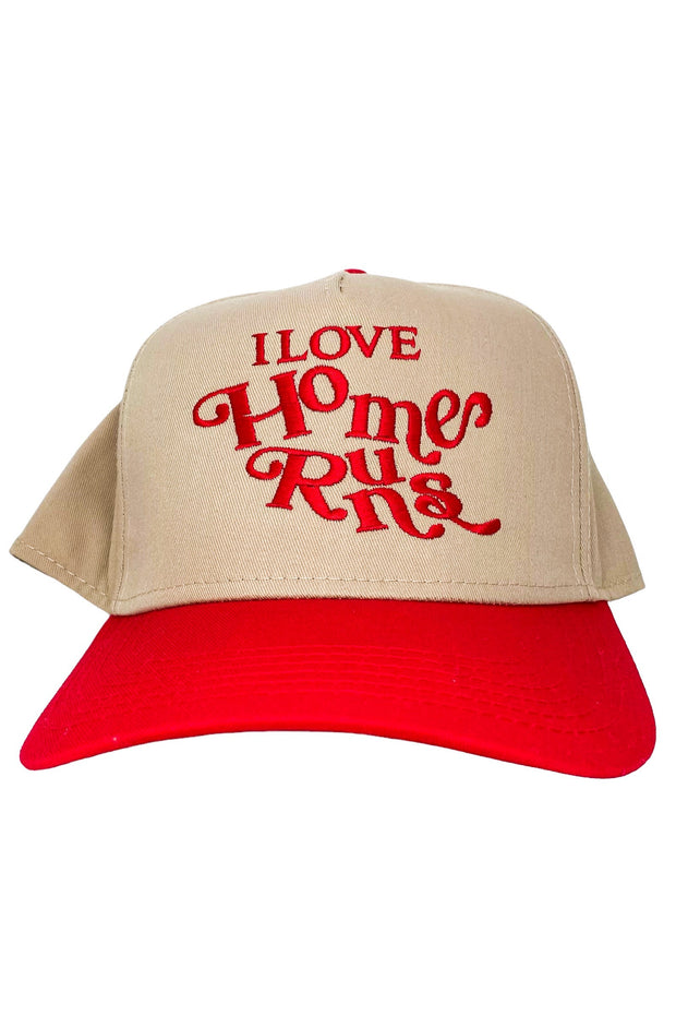 Unleash your inner homerun hitter with the I Love Homeruns Hat. This khaki hat features a vibrant red bill and bold red writing, making it a stylish accessory for any baseball fan. Show off your love for the game while staying cool and protected from the sun.