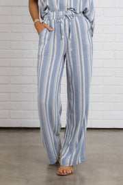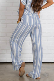 Designed with a convenient elastic pull-on waistband and functional pockets, these pants feature a classic striped print and a flattering wide leg silhouette.