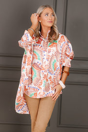 This Blouse features a button-down front and smooth satin material, offering a comfortable and elegant fit. Its abstract print adds a modern touch, making it perfect for both casual and dressier occasions.