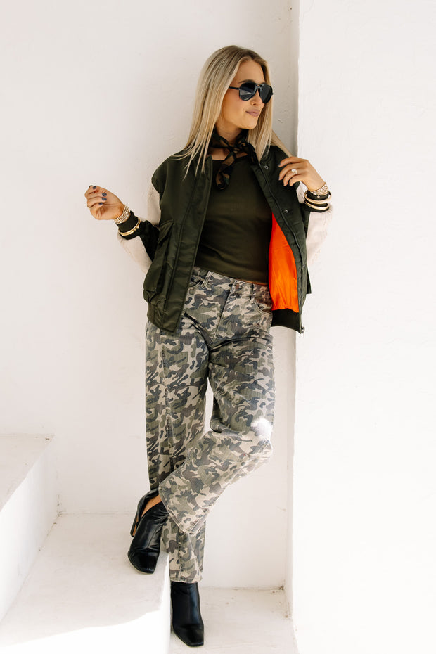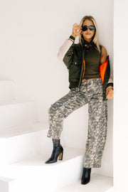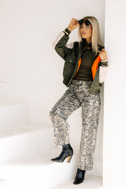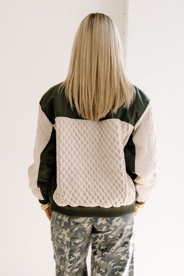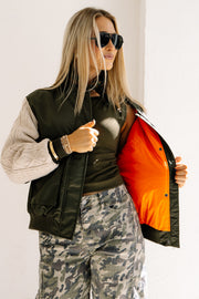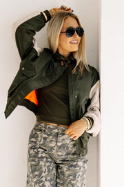 The Street Lights Military Green Long Sleeve Bomber Jacket features sweater detailing on the sleeves for added texture. It includes front bust pockets and a snap button and zip closure, combining practicality with a classic military-inspired style.