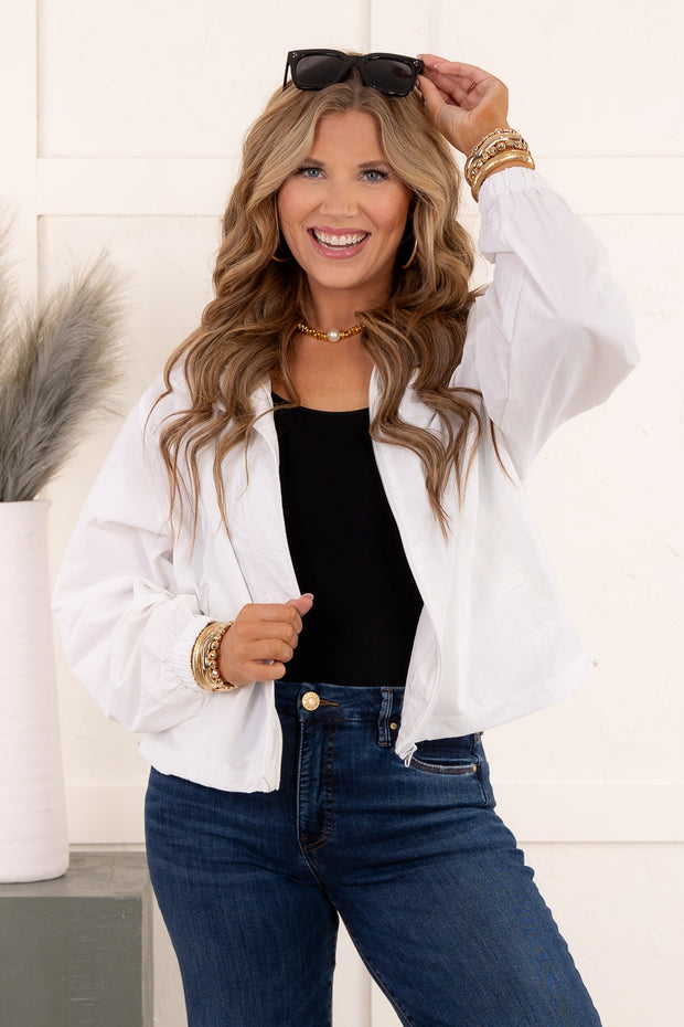 Expertly designed for style and practicality, the Cool Girl Jacket in Off White features a zip down closure, front pockets, and a top collar. Its waist length cut adds a chic touch to any outfit. Made with quality materials for long-lasting wear.