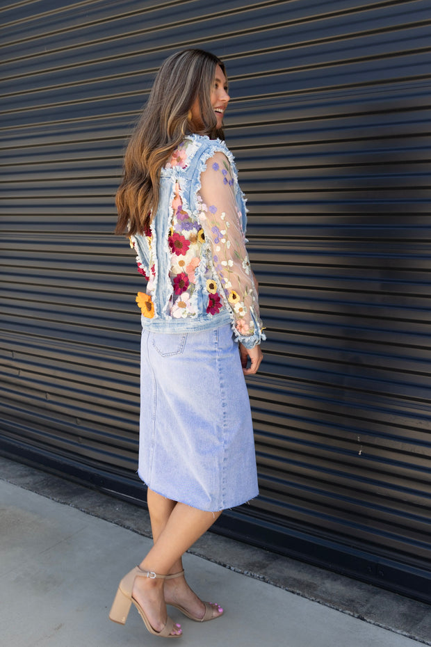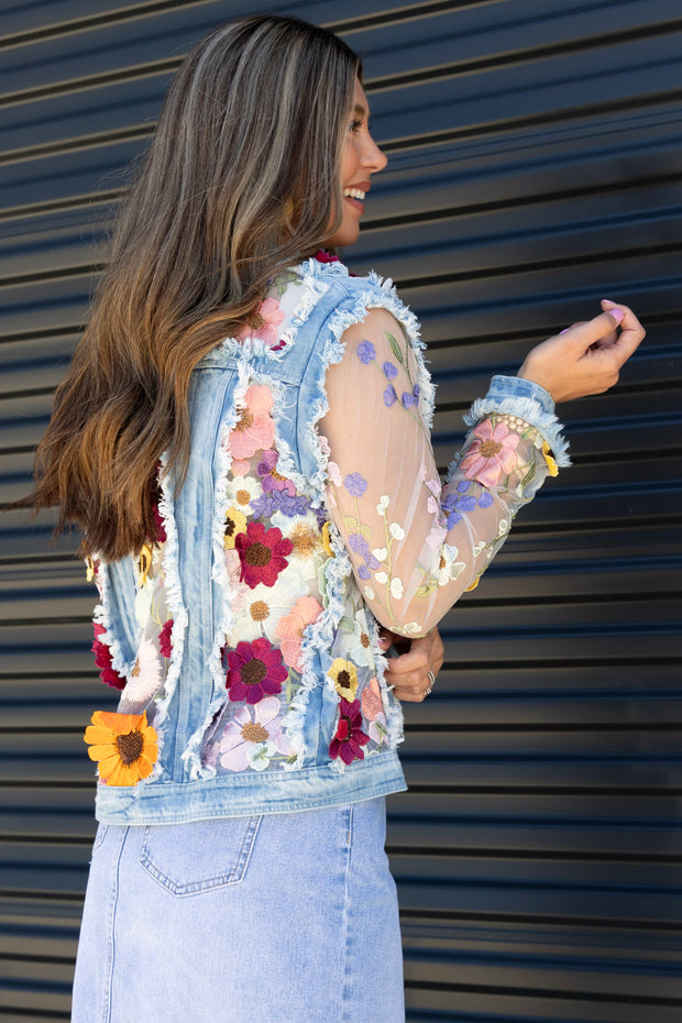 This Fields Of Flowers Jacket is perfect for adding a touch of femininity to any outfit. The button down front and cropped length add a modern twist, while the floral mesh sleeves and top collar provide a delicate and elegant touch. Stay stylish and on-trend with this must-have jacket.