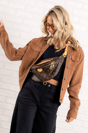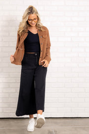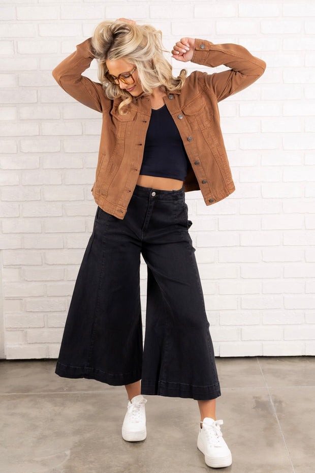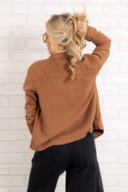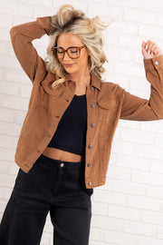 This Jacket features a stylish top collar, long sleeves, and a button down front for a classic look. With its toffee denim appearance, this waist-length jacket is perfect for everyday wear. Also includes convenient side pockets for added functionality.