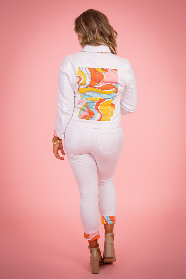 The Janelle Jean offers a comfortable, straight fit with a stylish abstract print detailing at the bottom cuff. The front zip button closure and functional pockets provide ease and functionality. A must-have for any wardrobe.