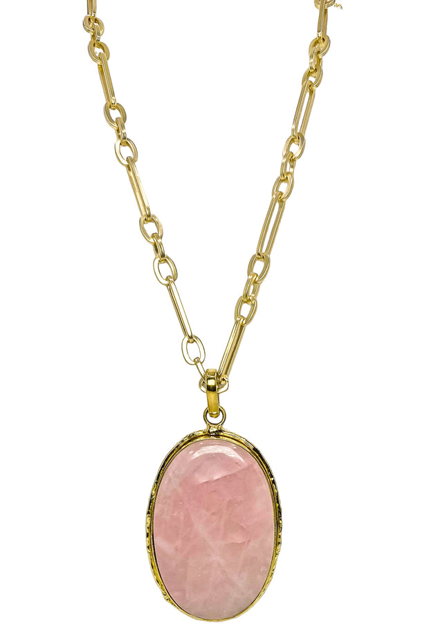 The Kassy Necklace features a chain link design with a stunning rose quartz stone set in a gold plated pendant. With its elegant style and natural properties, this necklace is the perfect accessory for any outfit.