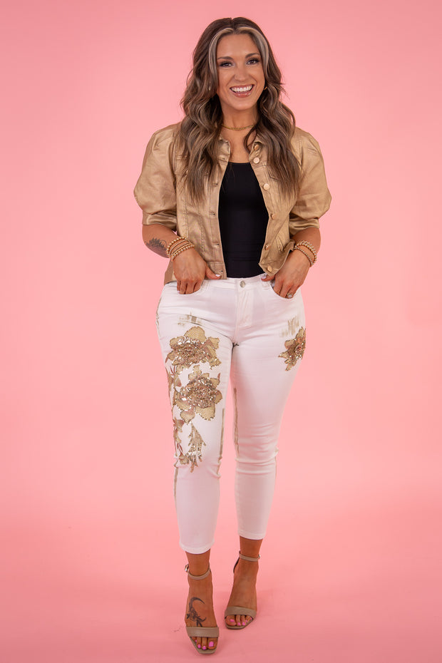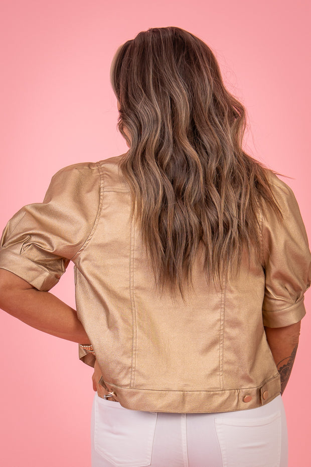 The Jenny Jacket is a stylish addition to any wardrobe. With its short sleeves and button down front, it offers both comfort and convenience. The top collar adds a touch of sophistication, while the metallic coating gives it a modern edge. Make a statement with this fashionable and functional jacket.