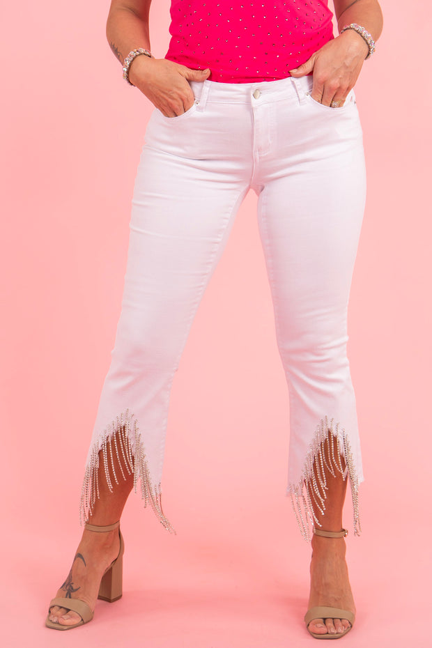 The Jewel Jean offers maximum comfort with its stretchy material and functional pockets. Its stylish design is enhanced by a rhinestone detailed hemline and a front zip button closure. Perfect for everyday wear, this jean combines fashion and functionality effortlessly.