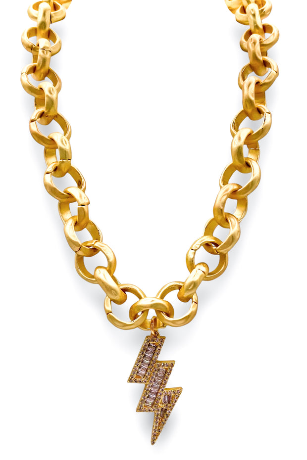 This stunning Electrifying Necklace in gold features a Jumbo Rolo chain adorned with a striking Lightening Bolt pendant. With its sleek design and bold statement, this necklace is sure to add a touch of electrifying glamour to any outfit. Strong and impactful, this piece is perfect for the fashion-forward and adventurous.