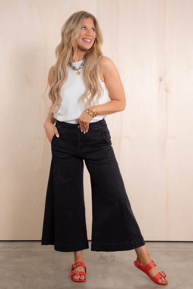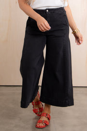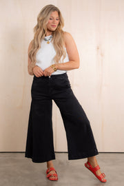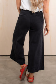 These jeans feature a deep black color and fashionable wide leg silhouette. Designed with convenient back and side pockets for practicality, plus a secure zip and button closure. Made from comfortable denim that moves with you throughout the day.