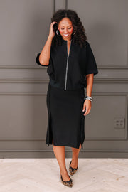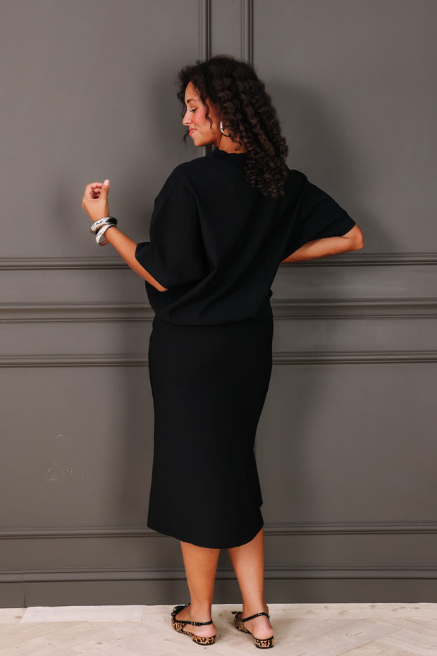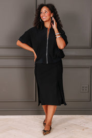 Wrap yourself in effortless elegance with this Skirt. The elastic waistband allows for a perfect and comfortable fit, while the midi length with a side slit adds a touch of sophistication.