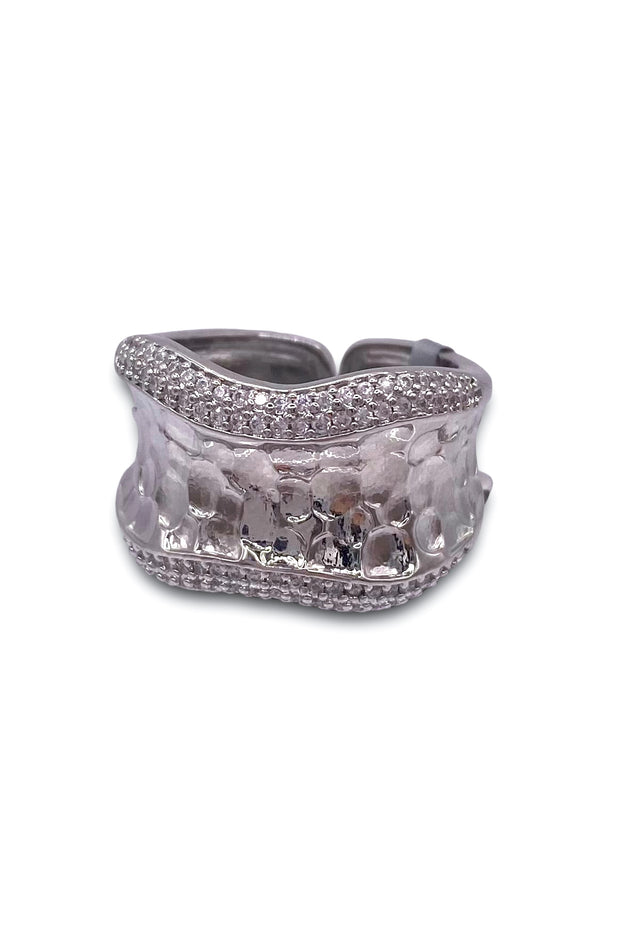 This statement ring boasts a beautifully hammered finish and delicate crystal detailing. The combination of textures creates a unique and eye-catching design, perfect for adding a touch of elegance to any outfit. The hammered finish also gives the ring a bold and modern look, making it a versatile accessory for any occasion.
