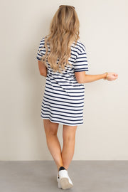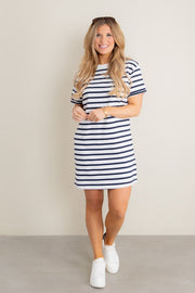 This elegant dress boasts a rounded neckline and short sleeves, creating a flattering silhouette. The subtle striped print adds a touch of sophistication, while the front pocket adds both style and convenience.