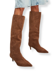 Build out your capsule collection of footwear with this timeless knee-high boot lifted by a low kitten heel inspired by vintage aesthetics.