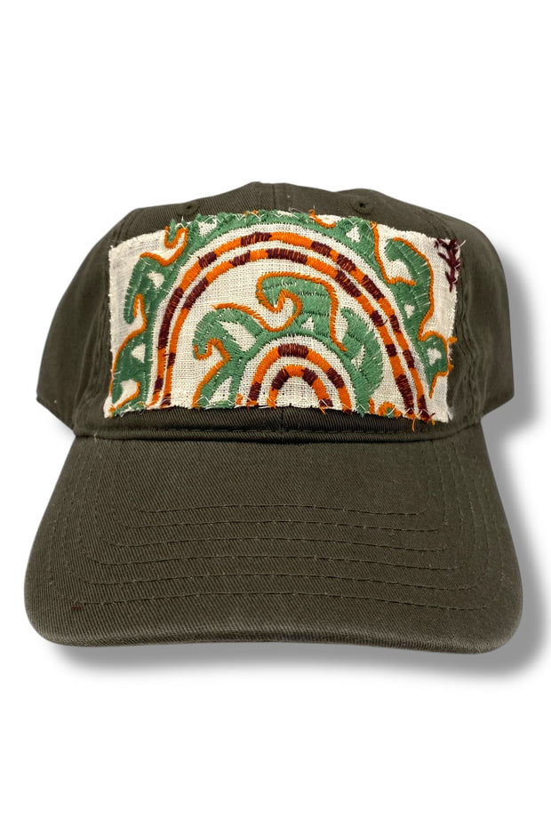 Your easy, throw-on-and-go, ball cap with Turkish kilim patch. No two are alike! One size hat with structured bill and a ball cap fit with adjustable snaps. Each piece has been stitched to ensure quality and discourage fraying (Fraying adds character your collectable) while maintaining the integrity of the fabric. However, due to the nature of the textiles, some fraying may occur. Additionally, color variations & imperfections should be expected as the norm. Wear with care!