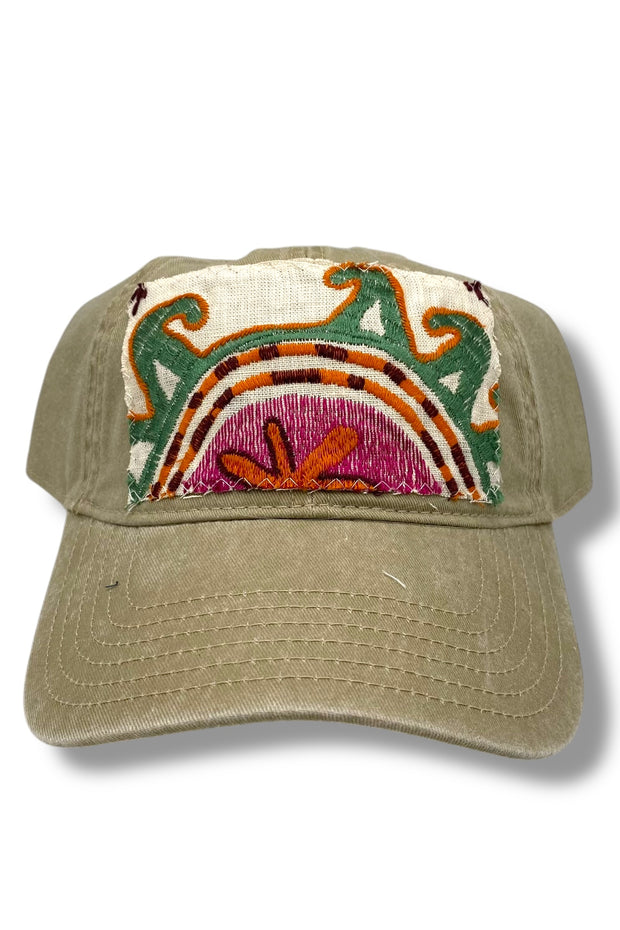 Your easy, throw-on-and-go, ball cap with Turkish kilim patch. No two are alike! One size hat with structured bill and a ball cap fit with adjustable snaps. Each piece has been stitched to ensure quality and discourage fraying (Fraying adds character your collectable) while maintaining the integrity of the fabric. However, due to the nature of the textiles, some fraying may occur. Additionally, color variations & imperfections should be expected as the norm. Wear with care!