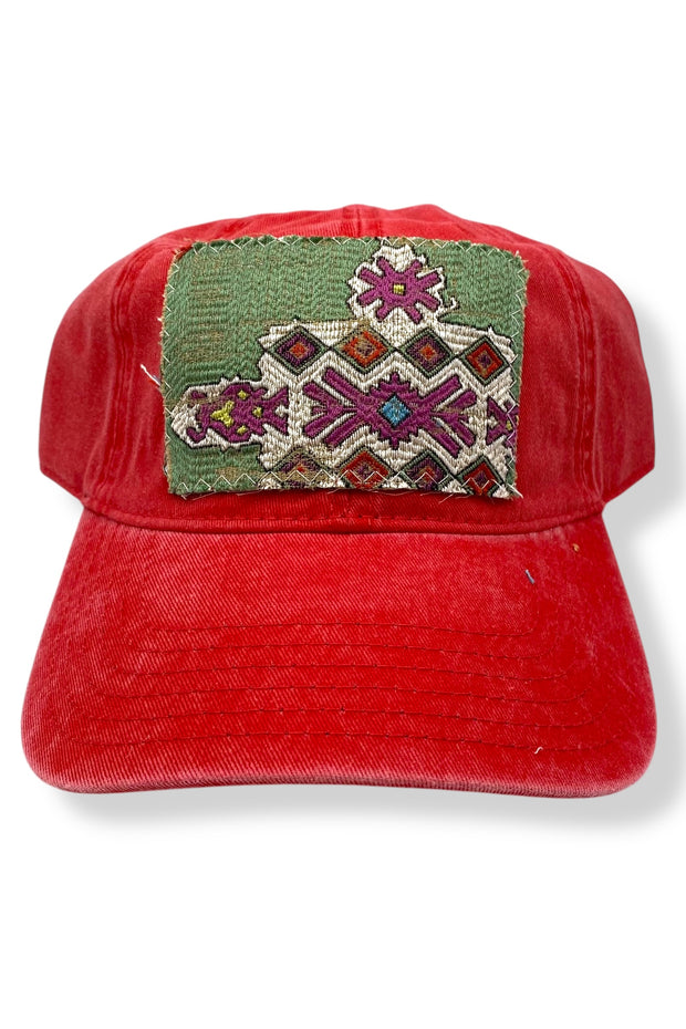 Your easy, throw-on-and-go, ball cap with Turkish kilim patch. No two are alike! One size hat with structured bill and a ball cap fit with adjustable snaps. Each piece has been stitched to ensure quality and discourage fraying (Fraying adds character your collectable) while maintaining the integrity of the fabric. However, due to the nature of the textiles, some fraying may occur. Additionally, color variations & imperfections should be expected as the norm. Wear with care!