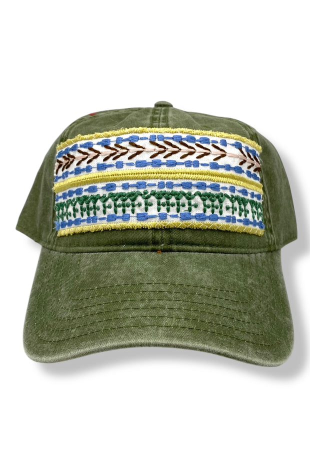 Your easy, throw-on-and-go, ball cap with Turkish kilim patch. No two are alike! One size hat with structured bill and a ball cap fit with adjustable snaps. Each piece has been stitched to ensure quality and discourage fraying (Fraying adds character your collectable) while maintaining the integrity of the fabric. However, due to the nature of the textiles, some fraying may occur. Additionally, color variations & imperfections should be expected as the norm. Wear with care!