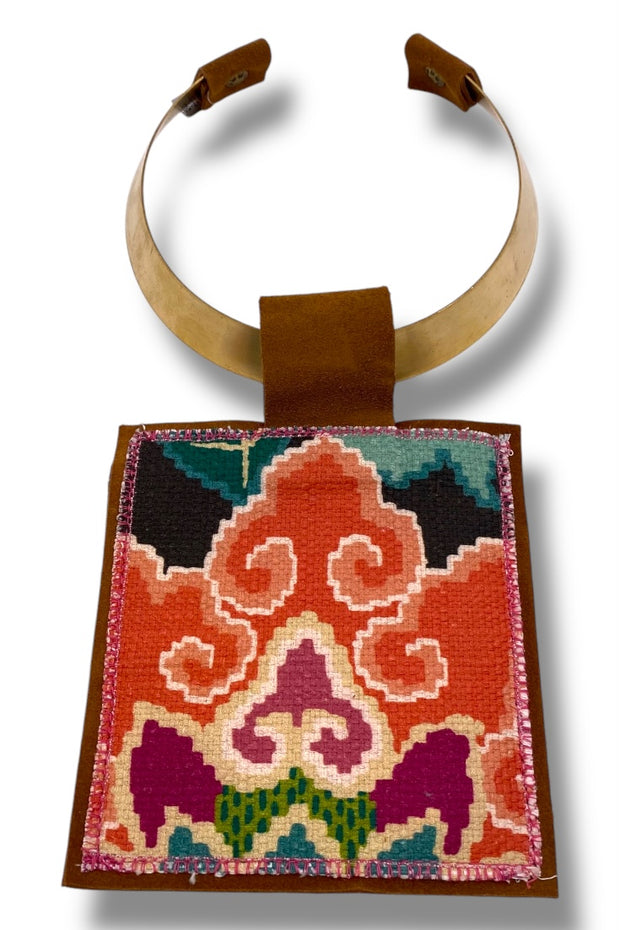 Backed with suede and packing a bold punch, these pendants are made from vintage Turkish kilim textiles and are one-of-a-kind. The ultimate statement piece. Each piece has been stitched to ensure quality and discourage fraying (Fraying adds character to your one of a kind piece!) while maintaining the integrity of the fabric. However, due to the nature of the textiles, some fraying may occur. Additionally, color variations & imperfections should be expected as the norm. Wear with care!