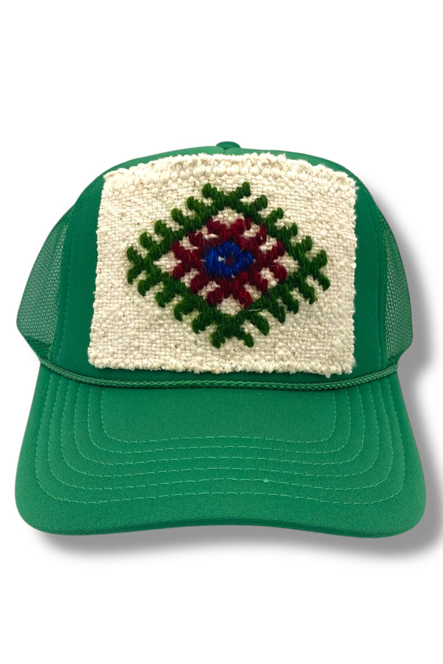 Your easy, throw-on-and-go, trucker with Turkish kilim patch. No two are alike! One size hat with structured bill and mesh back with adjustable snaps. Each piece has been stitched to ensure quality and discourage fraying (Frayering adds character your collectable) while maintaining the integrity of the fabric. However, due to the nature of the textiles, some fraying may occur. Additionally, color variations & imperfections should be expected as the norm. Wear with care!