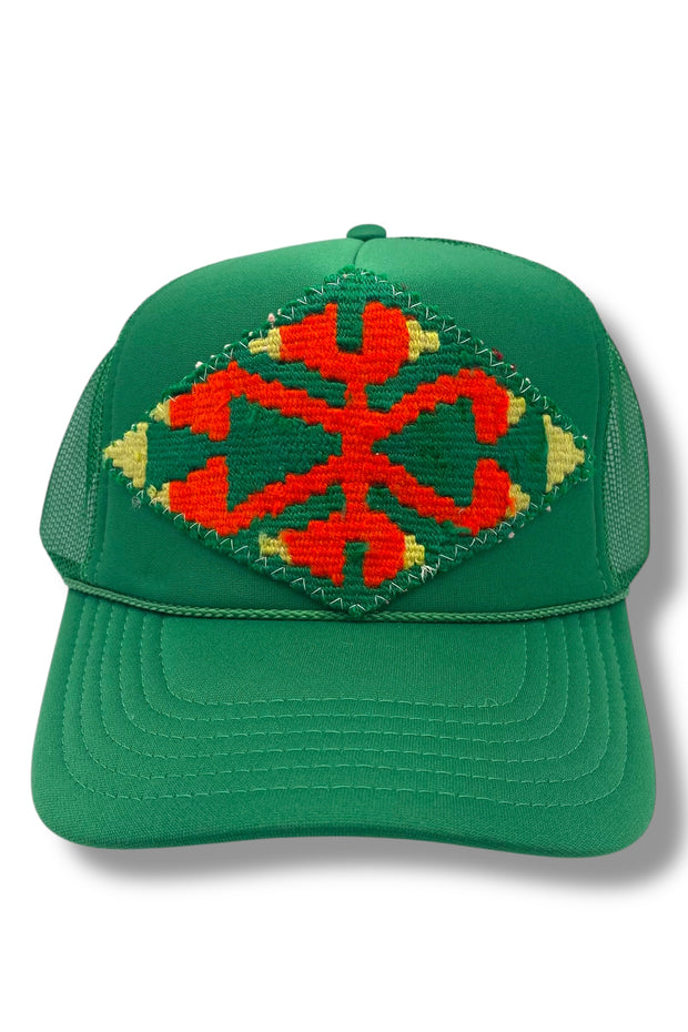 Your easy, throw-on-and-go, trucker with Turkish kilim patch. No two are alike! One size hat with structured bill and mesh back with adjustable snaps. Each piece has been stitched to ensure quality and discourage fraying (Frayering adds character your collectable) while maintaining the integrity of the fabric. However, due to the nature of the textiles, some fraying may occur. Additionally, color variations & imperfections should be expected as the norm. Wear with care!
