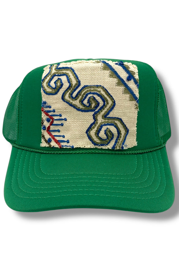 Your easy, throw-on-and-go, trucker with Turkish kilim patch. No two are alike! One size hat with structured bill and mesh back with adjustable snaps. Each piece has been stitched to ensure quality and discourage fraying (Frayering adds character your collectable) while maintaining the integrity of the fabric. However, due to the nature of the textiles, some fraying may occur. Additionally, color variations & imperfections should be expected as the norm. Wear with care!
