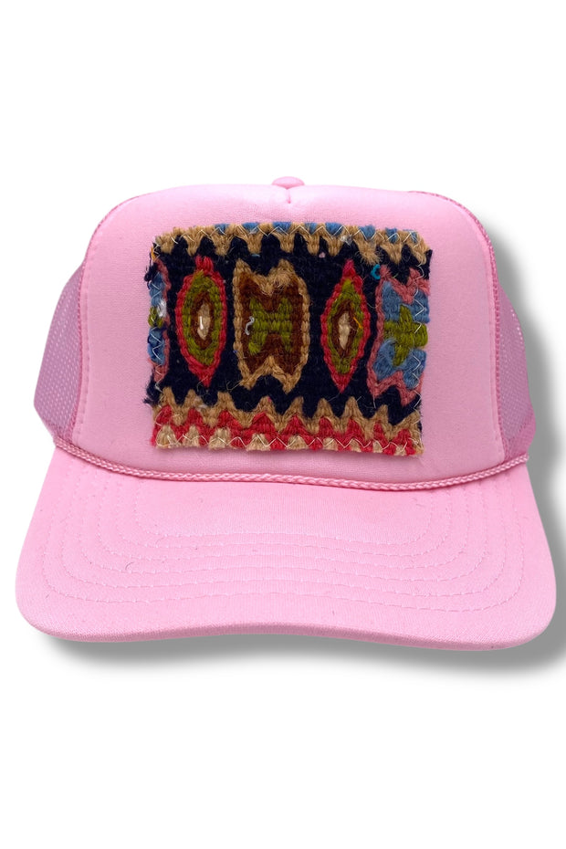 Your easy, throw-on-and-go, trucker with Turkish kilim patch. No two are alike! One size hat with structured bill and mesh back with adjustable snaps. Each piece has been stitched to ensure quality and discourage fraying (Frayering adds character your collectable) while maintaining the integrity of the fabric. However, due to the nature of the textiles, some fraying may occur. Additionally, color variations & imperfections should be expected as the norm. Wear with care!
