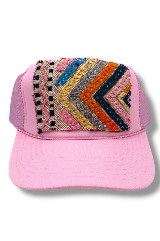 Your easy, throw-on-and-go, trucker with Turkish kilim patch. No two are alike! One size hat with structured bill and mesh back with adjustable snaps. Each piece has been stitched to ensure quality and discourage fraying (Frayering adds character your collectable) while maintaining the integrity of the fabric. However, due to the nature of the textiles, some fraying may occur. Additionally, color variations & imperfections should be expected as the norm. Wear with care!