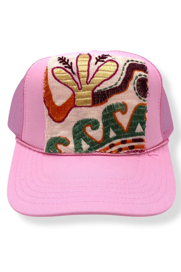 Your easy, throw-on-and-go, trucker with Turkish kilim patch. No two are alike! One size hat with structured bill and mesh back with adjustable snaps. Each piece has been stitched to ensure quality and discourage fraying (Fraying adds character your collectable) while maintaining the integrity of the fabric. However, due to the nature of the textiles, some fraying may occur. Additionally, color variations & imperfections should be expected as the norm. Wear with care!