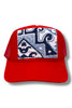 Your easy, throw-on-and-go, trucker with Turkish kilim patch. No two are alike! One size hat with structured bill and mesh back with adjustable snaps. Each piece has been stitched to ensure quality and discourage fraying (Fraying adds character your collectable) while maintaining the integrity of the fabric. However, due to the nature of the textiles, some fraying may occur. Additionally, color variations & imperfections should be expected as the norm. Wear with care!