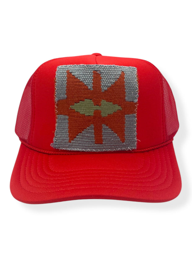 Your easy, throw-on-and-go, trucker with Turkish kilim patch. No two are alike! One size hat with structured bill and mesh back with adjustable snaps. Each piece has been stitched to ensure quality and discourage fraying (Fraying adds character your collectable) while maintaining the integrity of the fabric. However, due to the nature of the textiles, some fraying may occur. Additionally, color variations & imperfections should be expected as the norm. Wear with care!