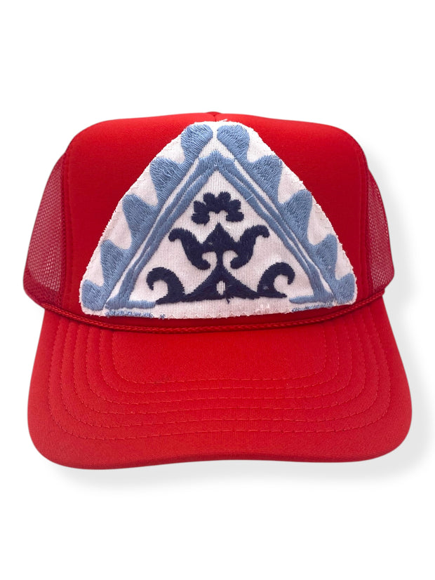 Your easy, throw-on-and-go, trucker with Turkish kilim patch. No two are alike! One size hat with structured bill and mesh back with adjustable snaps. Each piece has been stitched to ensure quality and discourage fraying (Fraying adds character your collectable) while maintaining the integrity of the fabric. However, due to the nature of the textiles, some fraying may occur. Additionally, color variations & imperfections should be expected as the norm. Wear with care!