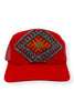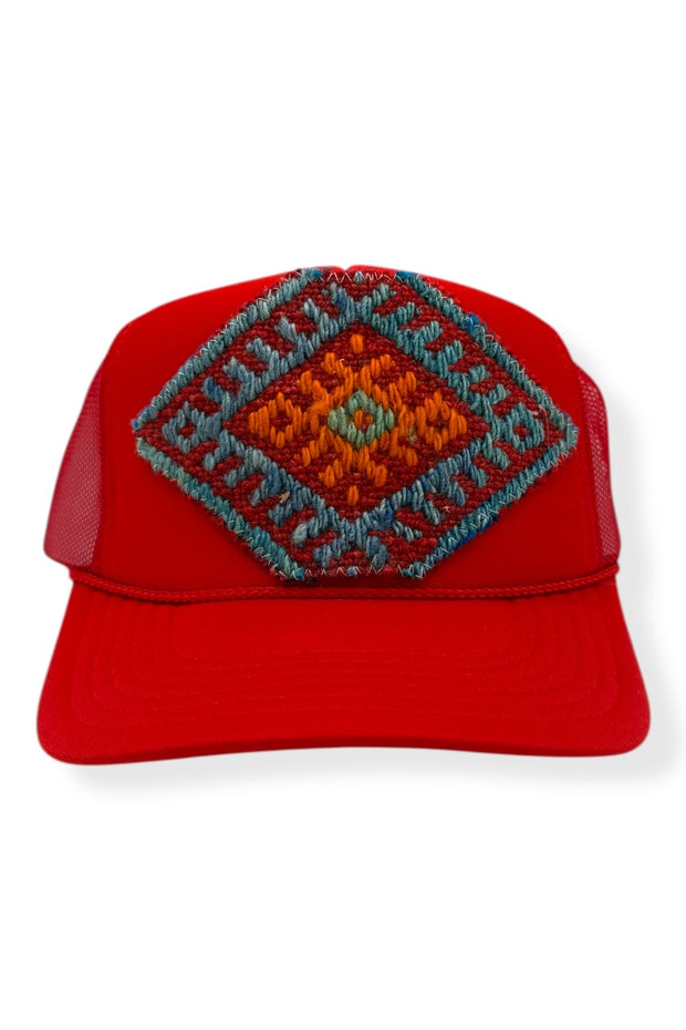 Your easy, throw-on-and-go, trucker with Turkish kilim patch. No two are alike! One size hat with structured bill and mesh back with adjustable snaps. Each piece has been stitched to ensure quality and discourage fraying (Fraying adds character your collectable) while maintaining the integrity of the fabric. However, due to the nature of the textiles, some fraying may occur. Additionally, color variations & imperfections should be expected as the norm. Wear with care!