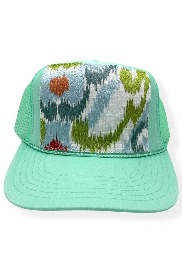 Your easy, throw-on-and-go, trucker with Turkish kilim patch. No two are alike! One size hat with structured bill and mesh back with adjustable snaps. Each piece has been stitched to ensure quality and discourage fraying (Fraying adds character your collectable) while maintaining the integrity of the fabric. However, due to the nature of the textiles, some fraying may occur. Additionally, color variations & imperfections should be expected as the norm. Wear with care!