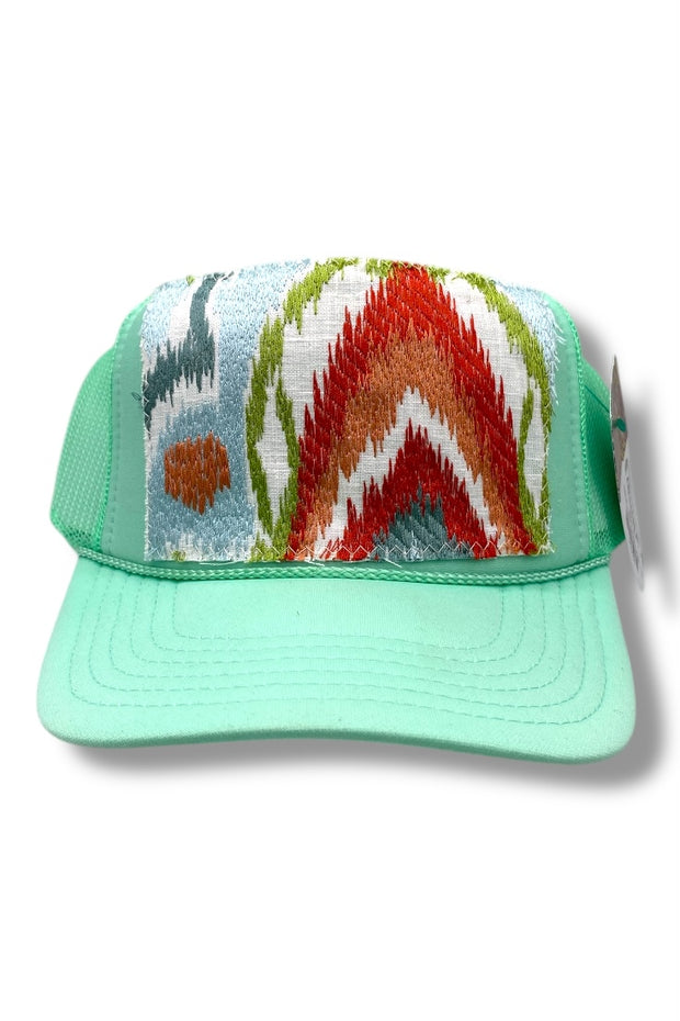 Your easy, throw-on-and-go, trucker with Turkish kilim patch. No two are alike! One size hat with structured bill and mesh back with adjustable snaps. Each piece has been stitched to ensure quality and discourage fraying (Fraying adds character your collectable) while maintaining the integrity of the fabric. However, due to the nature of the textiles, some fraying may occur. Additionally, color variations & imperfections should be expected as the norm. Wear with care!