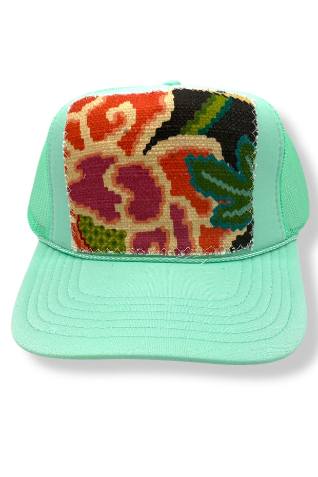 Your easy, throw-on-and-go, trucker with Turkish kilim patch. No two are alike! One size hat with structured bill and mesh back with adjustable snaps. Each piece has been stitched to ensure quality and discourage fraying (Frayering adds character your collectable) while maintaining the integrity of the fabric. However, due to the nature of the textiles, some fraying may occur. Additionally, color variations & imperfections should be expected as the norm. Wear with care!