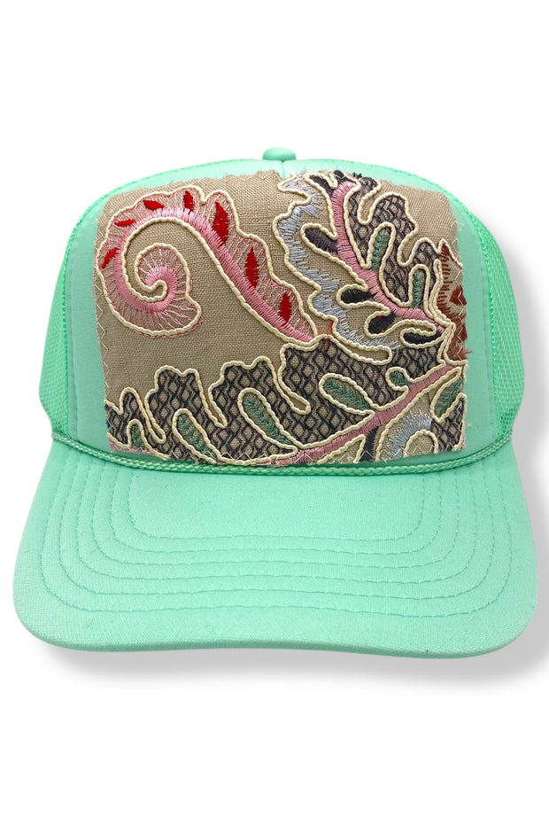 Your easy, throw-on-and-go, trucker with Turkish kilim patch. No two are alike! One size hat with structured bill and mesh back with adjustable snaps. Each piece has been stitched to ensure quality and discourage fraying (Frayering adds character your collectable) while maintaining the integrity of the fabric. However, due to the nature of the textiles, some fraying may occur. Additionally, color variations & imperfections should be expected as the norm. Wear with care!