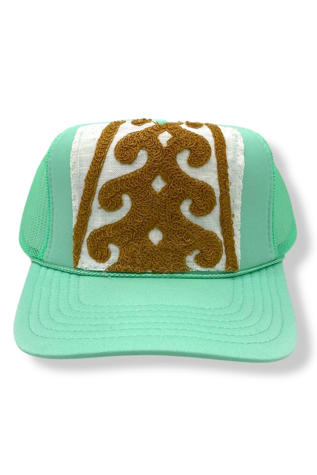 Your easy, throw-on-and-go, trucker with Turkish kilim patch. No two are alike! One size hat with structured bill and mesh back with adjustable snaps. Each piece has been stitched to ensure quality and discourage fraying (Frayering adds character your collectable) while maintaining the integrity of the fabric. However, due to the nature of the textiles, some fraying may occur. Additionally, color variations & imperfections should be expected as the norm. Wear with care!