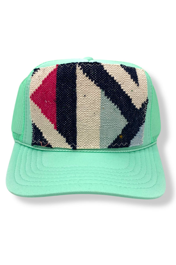 Your easy, throw-on-and-go, trucker with Turkish kilim patch. No two are alike! One size hat with structured bill and mesh back with adjustable snaps. Each piece has been stitched to ensure quality and discourage fraying (Frayering adds character your collectable) while maintaining the integrity of the fabric. However, due to the nature of the textiles, some fraying may occur. Additionally, color variations & imperfections should be expected as the norm. Wear with care!