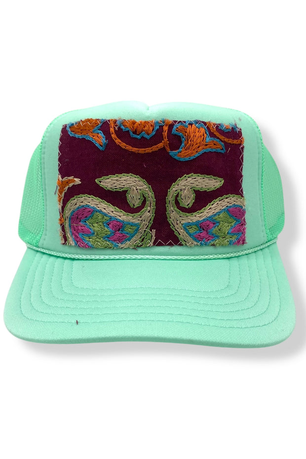 Your easy, throw-on-and-go, trucker with Turkish kilim patch. No two are alike! One size hat with structured bill and mesh back with adjustable snaps. Each piece has been stitched to ensure quality and discourage fraying (Frayering adds character your collectable) while maintaining the integrity of the fabric. However, due to the nature of the textiles, some fraying may occur. Additionally, color variations & imperfections should be expected as the norm. Wear with care!