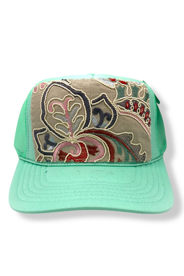 Your easy, throw-on-and-go, trucker with Turkish kilim patch. No two are alike! One size hat with structured bill and mesh back with adjustable snaps. Each piece has been stitched to ensure quality and discourage fraying (Fraying adds character your collectable) while maintaining the integrity of the fabric. However, due to the nature of the textiles, some fraying may occur. Additionally, color variations & imperfections should be expected as the norm. Wear with care!