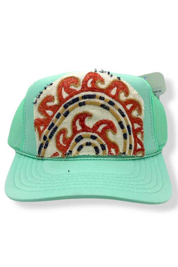 Your easy, throw-on-and-go, trucker with Turkish kilim patch. No two are alike! One size hat with structured bill and mesh back with adjustable snaps. Each piece has been stitched to ensure quality and discourage fraying (Fraying adds character your collectable) while maintaining the integrity of the fabric. However, due to the nature of the textiles, some fraying may occur. Additionally, color variations & imperfections should be expected as the norm. Wear with care!