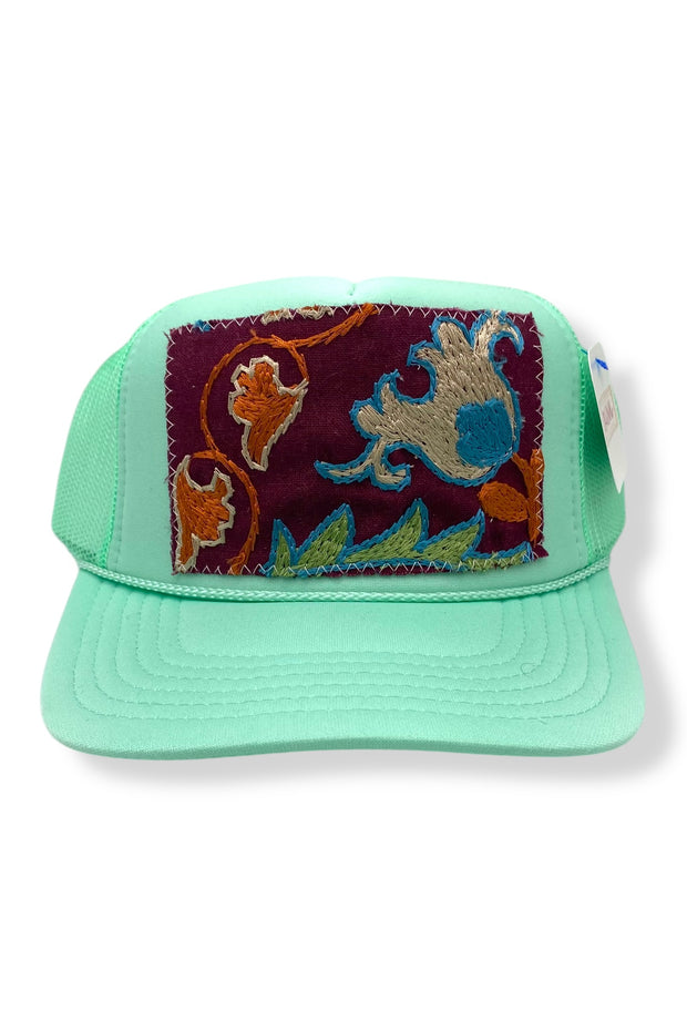 Your easy, throw-on-and-go, trucker with Turkish kilim patch. No two are alike! One size hat with structured bill and mesh back with adjustable snaps. Each piece has been stitched to ensure quality and discourage fraying (Fraying adds character your collectable) while maintaining the integrity of the fabric. However, due to the nature of the textiles, some fraying may occur. Additionally, color variations & imperfections should be expected as the norm. Wear with care!