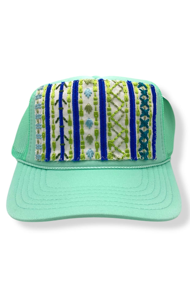 Your easy, throw-on-and-go, trucker with Turkish kilim patch. No two are alike! One size hat with structured bill and mesh back with adjustable snaps. Each piece has been stitched to ensure quality and discourage fraying (Fraying adds character your collectable) while maintaining the integrity of the fabric. However, due to the nature of the textiles, some fraying may occur. Additionally, color variations & imperfections should be expected as the norm. Wear with care!