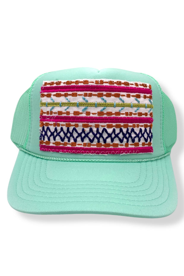 Your easy, throw-on-and-go, trucker with Turkish kilim patch. No two are alike! One size hat with structured bill and mesh back with adjustable snaps. Each piece has been stitched to ensure quality and discourage fraying (Fraying adds character your collectable) while maintaining the integrity of the fabric. However, due to the nature of the textiles, some fraying may occur. Additionally, color variations & imperfections should be expected as the norm. Wear with care!