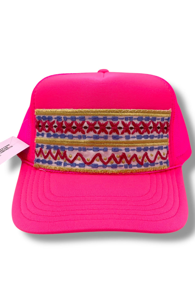 Your easy, throw-on-and-go, trucker with Turkish kilim patch. No two are alike! One size hat with structured bill and mesh back with adjustable snaps. Each piece has been stitched to ensure quality and discourage fraying (Fraying adds character your collectable) while maintaining the integrity of the fabric. However, due to the nature of the textiles, some fraying may occur. Additionally, color variations & imperfections should be expected as the norm. Wear with care!