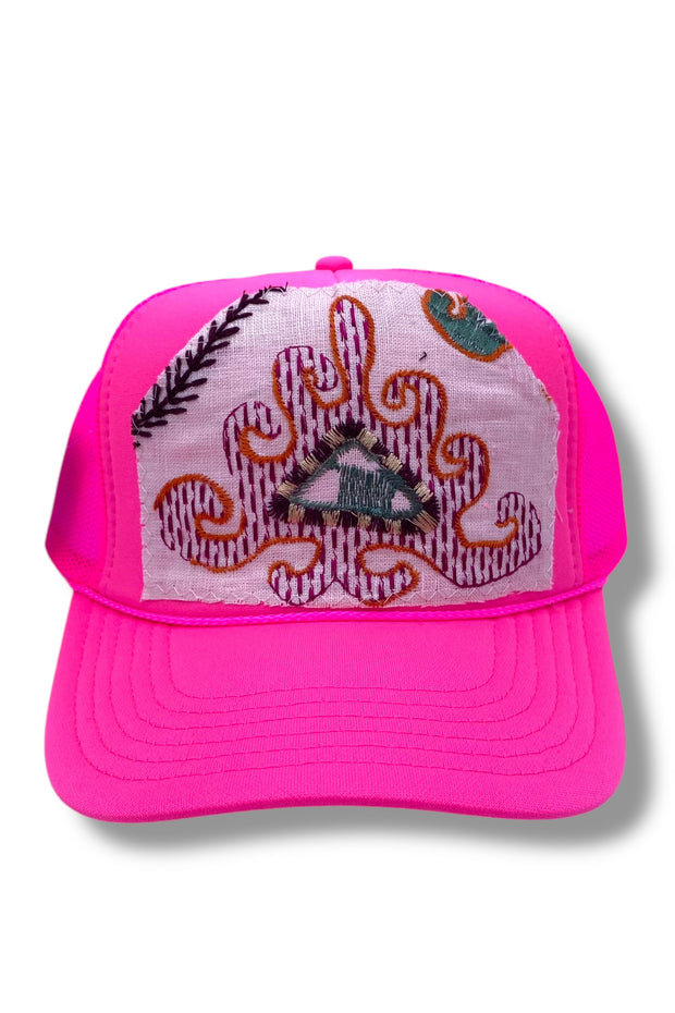 Your easy, throw-on-and-go, trucker with Turkish kilim patch. No two are alike! One size hat with structured bill and mesh back with adjustable snaps. Each piece has been stitched to ensure quality and discourage fraying (Fraying adds character your collectable) while maintaining the integrity of the fabric. However, due to the nature of the textiles, some fraying may occur. Additionally, color variations & imperfections should be expected as the norm. Wear with care!