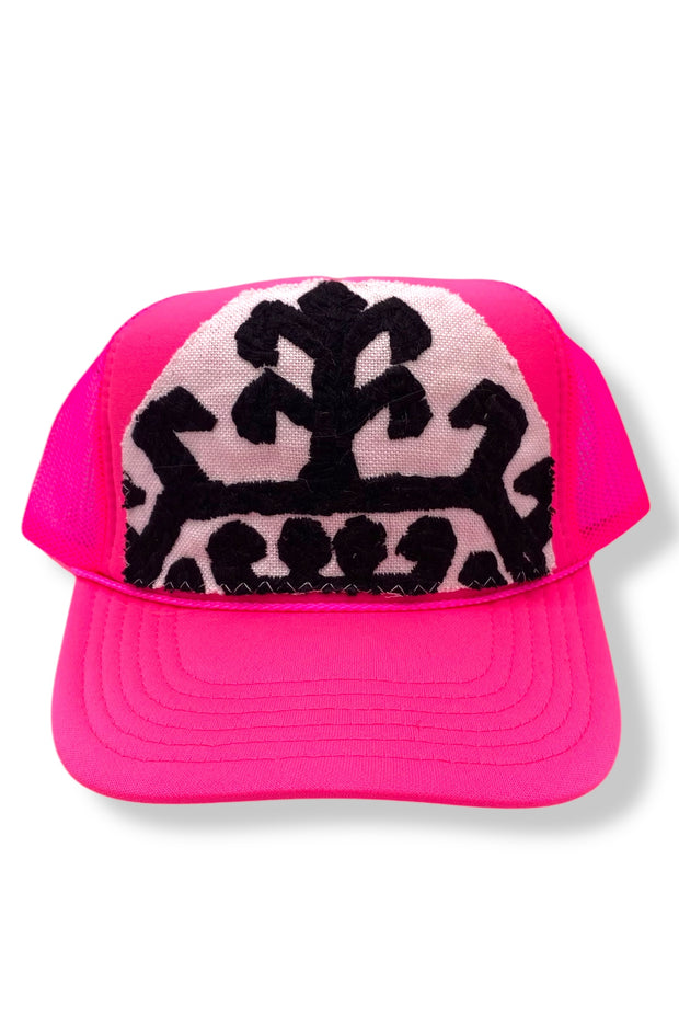 Your easy, throw-on-and-go, trucker with Turkish kilim patch. No two are alike! One size hat with structured bill and mesh back with adjustable snaps. Each piece has been stitched to ensure quality and discourage fraying (Fraying adds character your collectable) while maintaining the integrity of the fabric. However, due to the nature of the textiles, some fraying may occur. Additionally, color variations & imperfections should be expected as the norm. Wear with care!