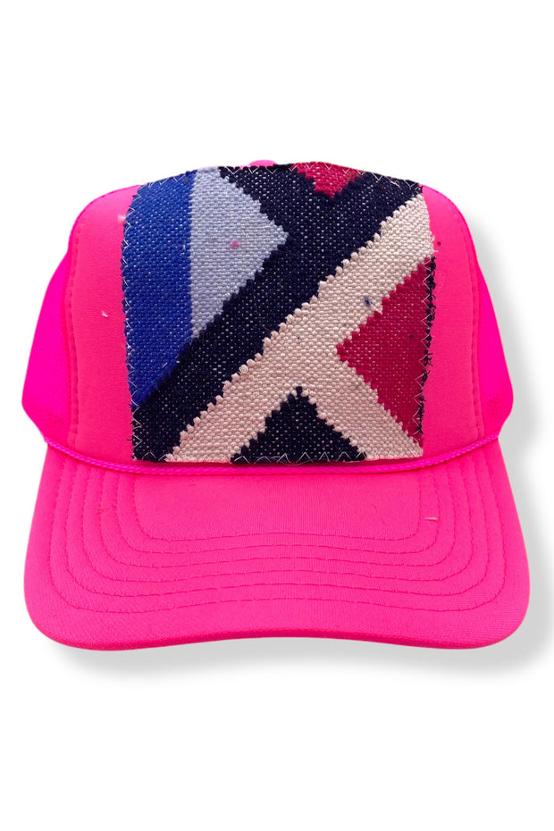 Your easy, throw-on-and-go, trucker with Turkish kilim patch. No two are alike! One size hat with structured bill and mesh back with adjustable snaps. Each piece has been stitched to ensure quality and discourage fraying (Fraying adds character your collectable) while maintaining the integrity of the fabric. However, due to the nature of the textiles, some fraying may occur. Additionally, color variations & imperfections should be expected as the norm. Wear with care!